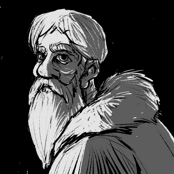 A series of monochrome studies of an elderly wizard named Isaac Grandeyes.